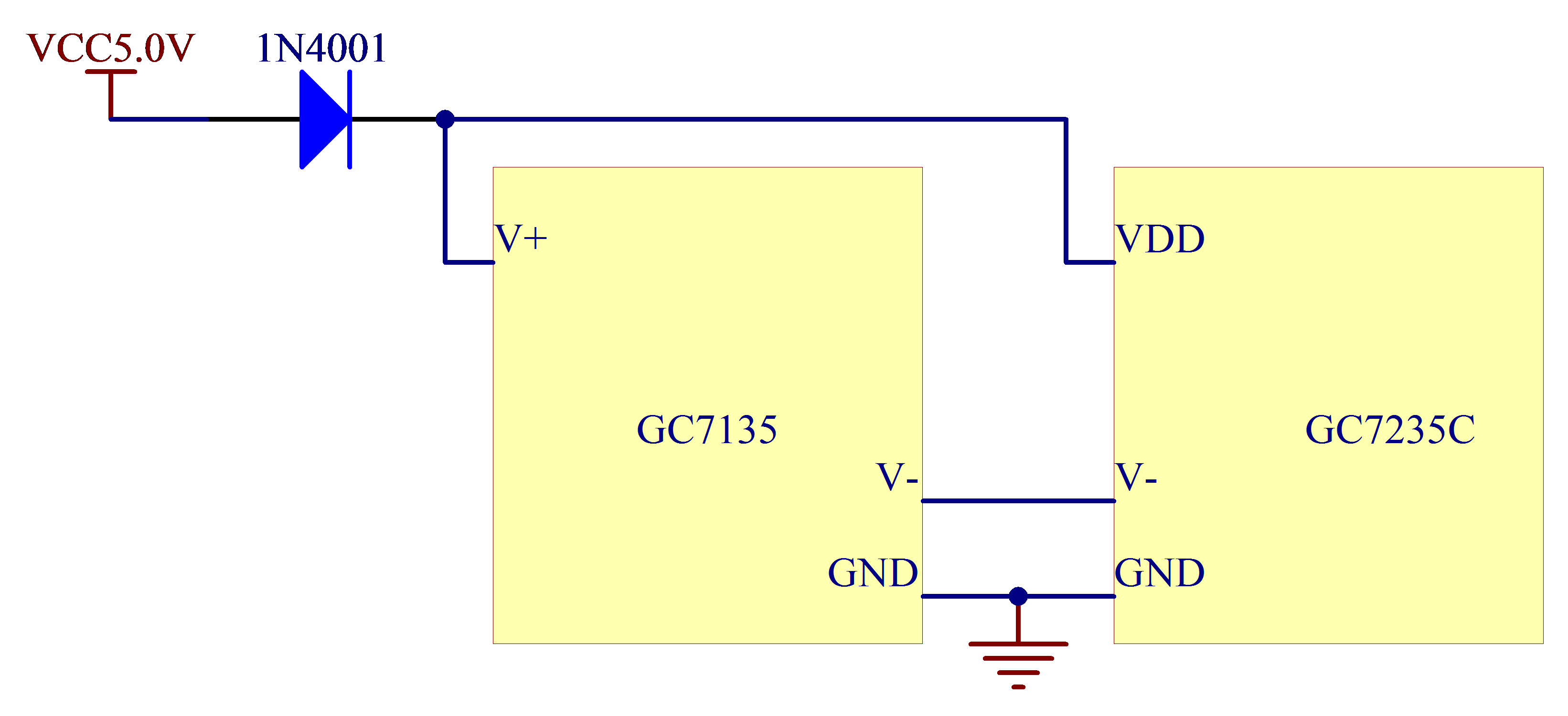 GC7135B工作电压相对较低,GC7135B与GC7235C一起使用时,建议将5V电源通过一个二极管(1N4001)再给GC7135B和GC7235C供电。如下图所示:
